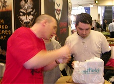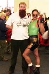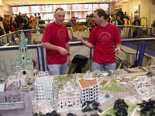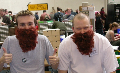 Using only a set of ginger beards as a disguise and wearing specially commissioned Colonel Marbles T-shirts in case of capture, these brave frothers searched the Salute Convention high and low for information critical to the Colonel's future plans. They may have recieved some quizzical looks, but their cunning disguises appeared to fool the locals long enough for them to return with this photographic document of the events therin. Learning the lesson of 2002 the frothers brought with them Qbusters badges, and despite Connex-based kerfuffles were all in the building before a number of stalls were set out. In particular we quickly discovered one Artemis Black and lovely assistant were still hard at work setting out their stall, having survived an exploding engine on the way in to the building! Our report will suggest that carting several tons of lead from the South of Wales is as likely an explanation as enemy mortar fire.