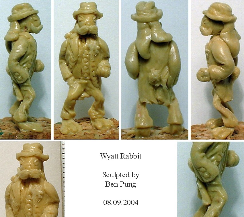 "Difficult to know what to say about this figure. The overall impression and shape of a (vewy wude) rabbit is there. The face could do with a bit more detail to make it seem more alive. As it is it looks somewhat like a zombified, or at least poorly stuffed leporid. Quite what possessed Bob (perhaps literally) to make a priapic zombie rabbit figure and submit it to an Alice in Wonderland sculpting competition is a question we are still mulling over. Creepy." |