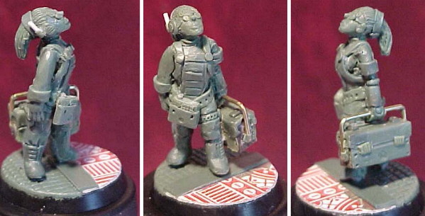 Sculptor's notes: The intention was to do a pastiche of classic spacesuit designs from old pulp fiction, and to some extent I think I succeeded with a few of the details, and the face looks at least vaguely female, as the veteran spacer, removes her helmet after a long days work. Pictures say a thousand words, and the included pictures do indeed say it all. This isn't a good sculpt. My technique is poor, and attempting to bring out the finished details in the translucent FIMO I used a dark wash, but this just muddied things further. The arms, and head are Greenstuff.