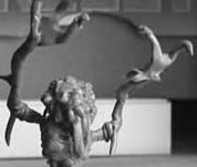 "A wonderfully new and different concept. The Temple Dog is a fun piece—the fur could use some work, but the face is terrific. The priestess's garments and paraphernalia aren't exceptional, but they do suggest the motion and flow for which I think the sculptor was striving. This is another model I'd like to see revisited as the sculptor progresses."