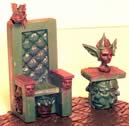 The mini diorama is designed to have many configurations. There are two extra pieces of flooring designed for Grimble, that can be attached to the outside of the main floor, with pegs in his feet to allow repositioning if desired elsewhere. The mirror's face is removeable, allowing a plain surface for the ambitious painter. All other pieces can be placed anywhere on the flooring. Grimble is designed to hold the Queen's shield, as well as the mirror. The queen can be removed from her throne if desired.